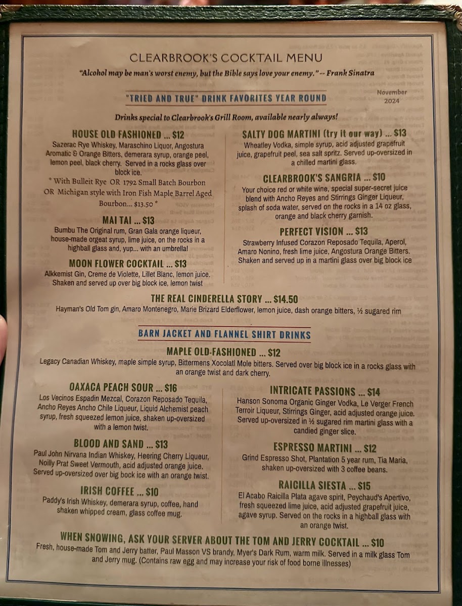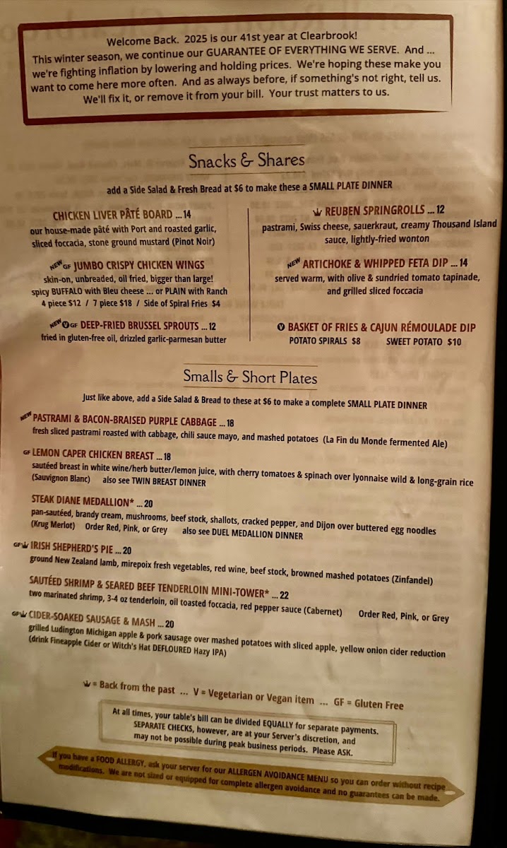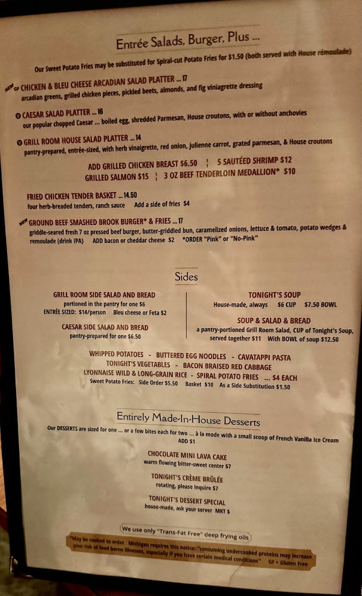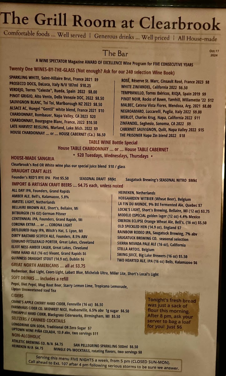 Clearbrook Golf Club's The Grill Room Restaurant Menu